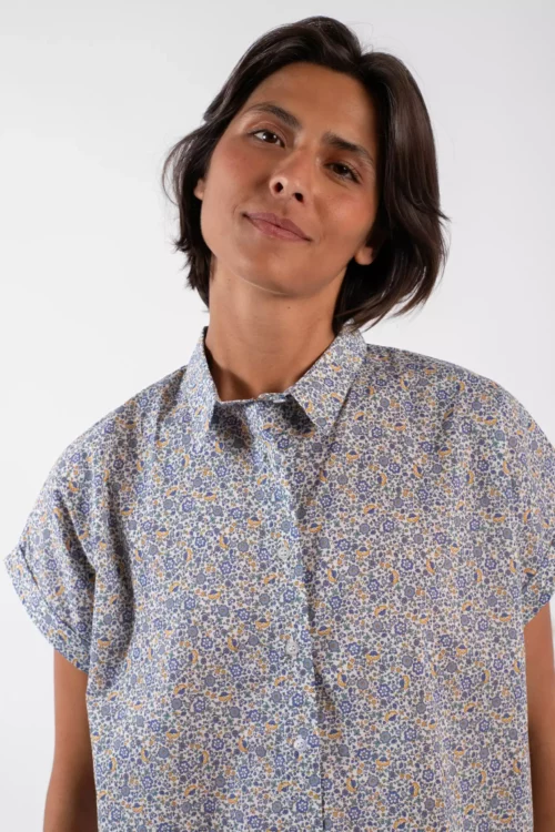 Chemisier femme manches courtes en coton, à coupe ample avec imprimés élégants, idéal pour la journée ou pour dormir.