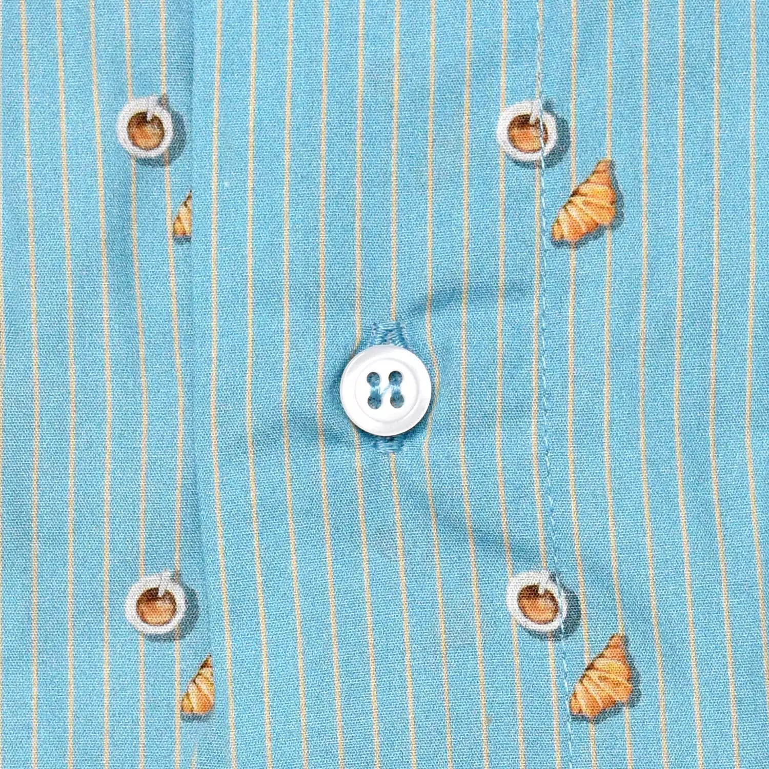 Petit déjeuner sur fond bleu rayé Un motif gourmand avec une tasse de café et un croissant sur un élégant fond bleu à rayures jaunes.