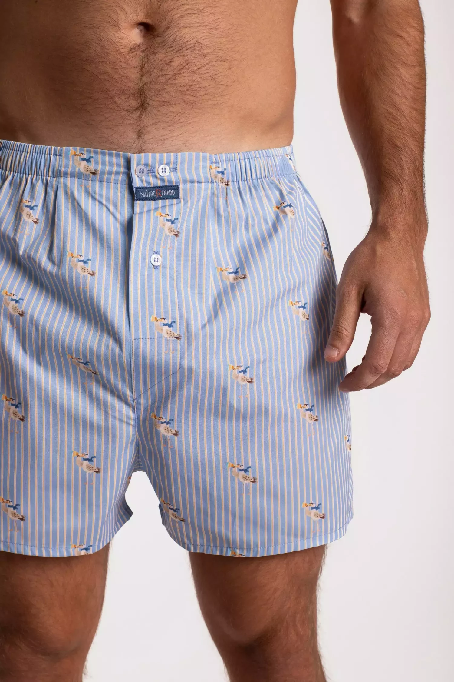 Caleçon rayé bleu et jaune illustrant fièrement une mouette scrutant l’horizon avec sa longue vue.