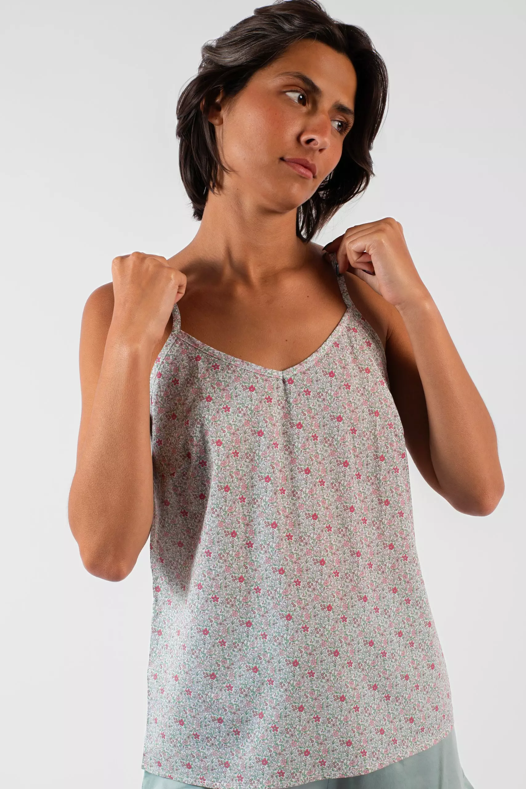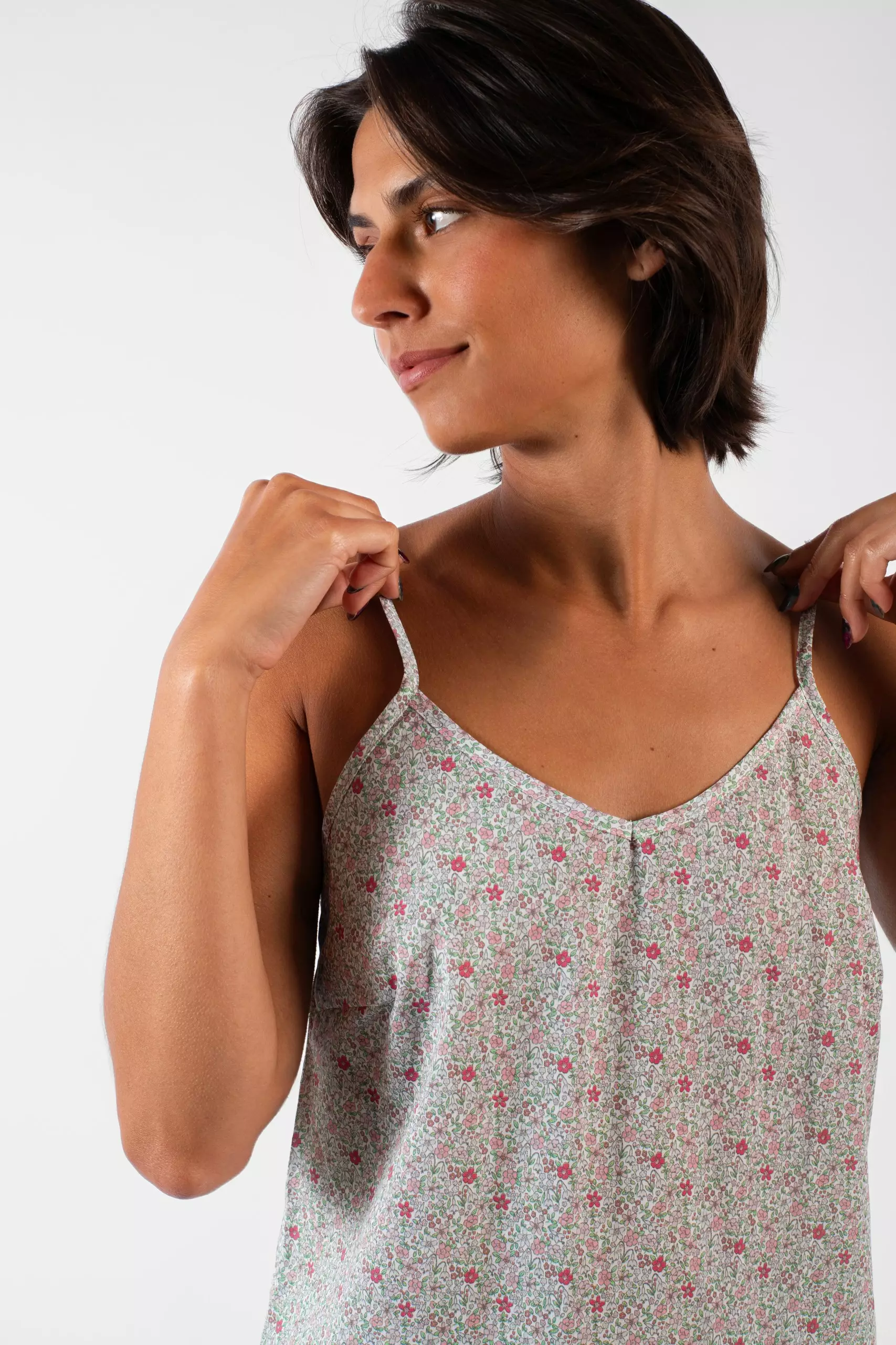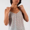 Détails : Caraco à fines bretelles, pinces poitrine et légère encolure en V.