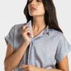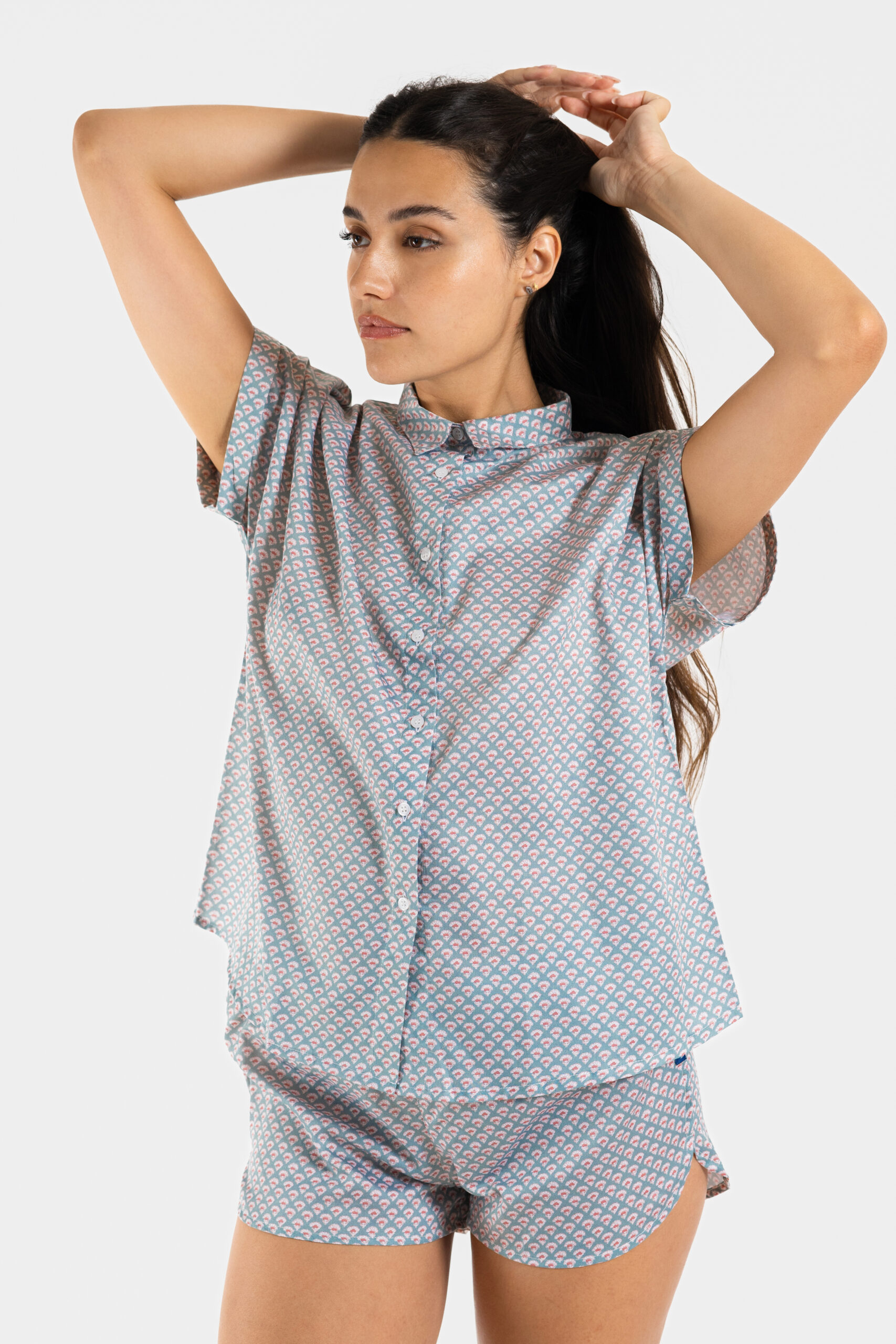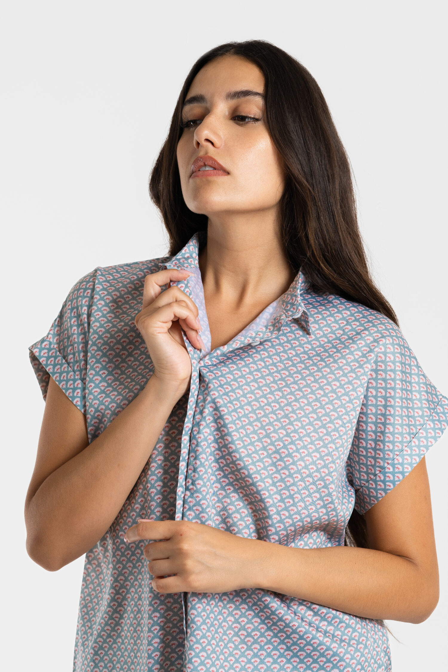 Chemisier manches courtes femme en satin de coton avec motif India, fabriqué au Portugal.