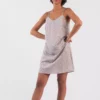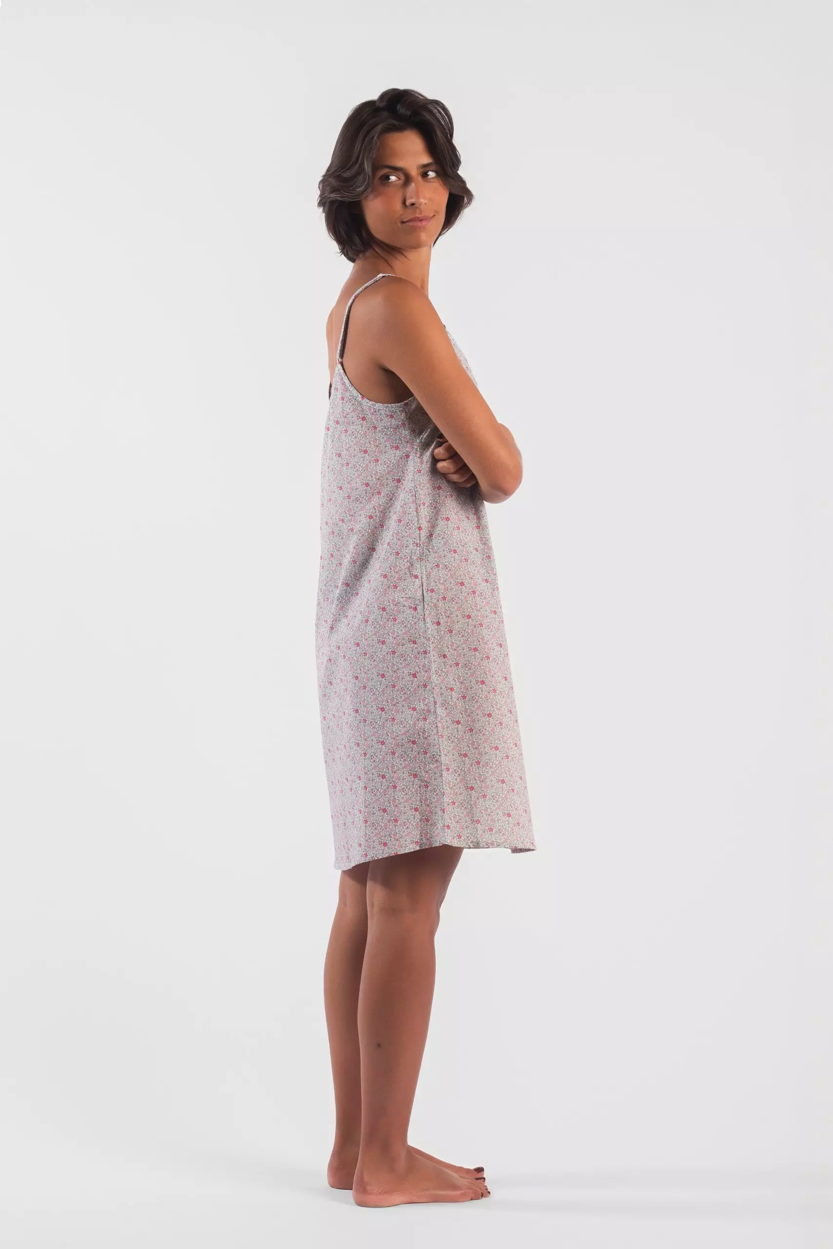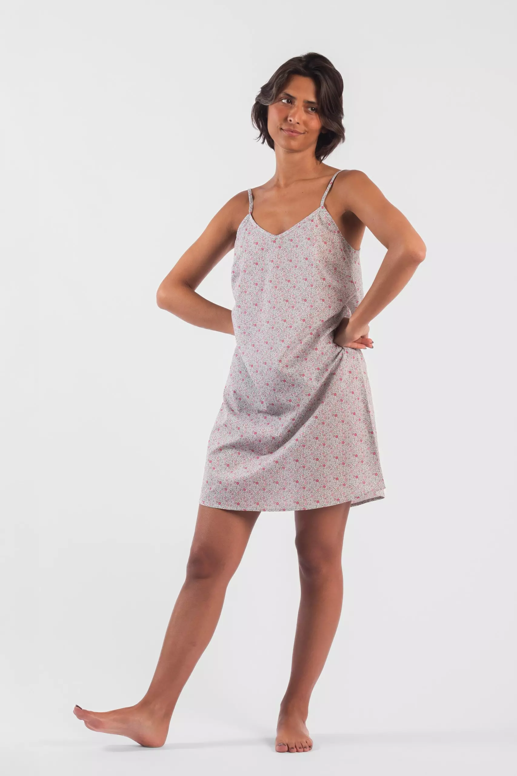 Détails : Nuisette à fines bretelles, pinces poitrine et légère encolure en V.