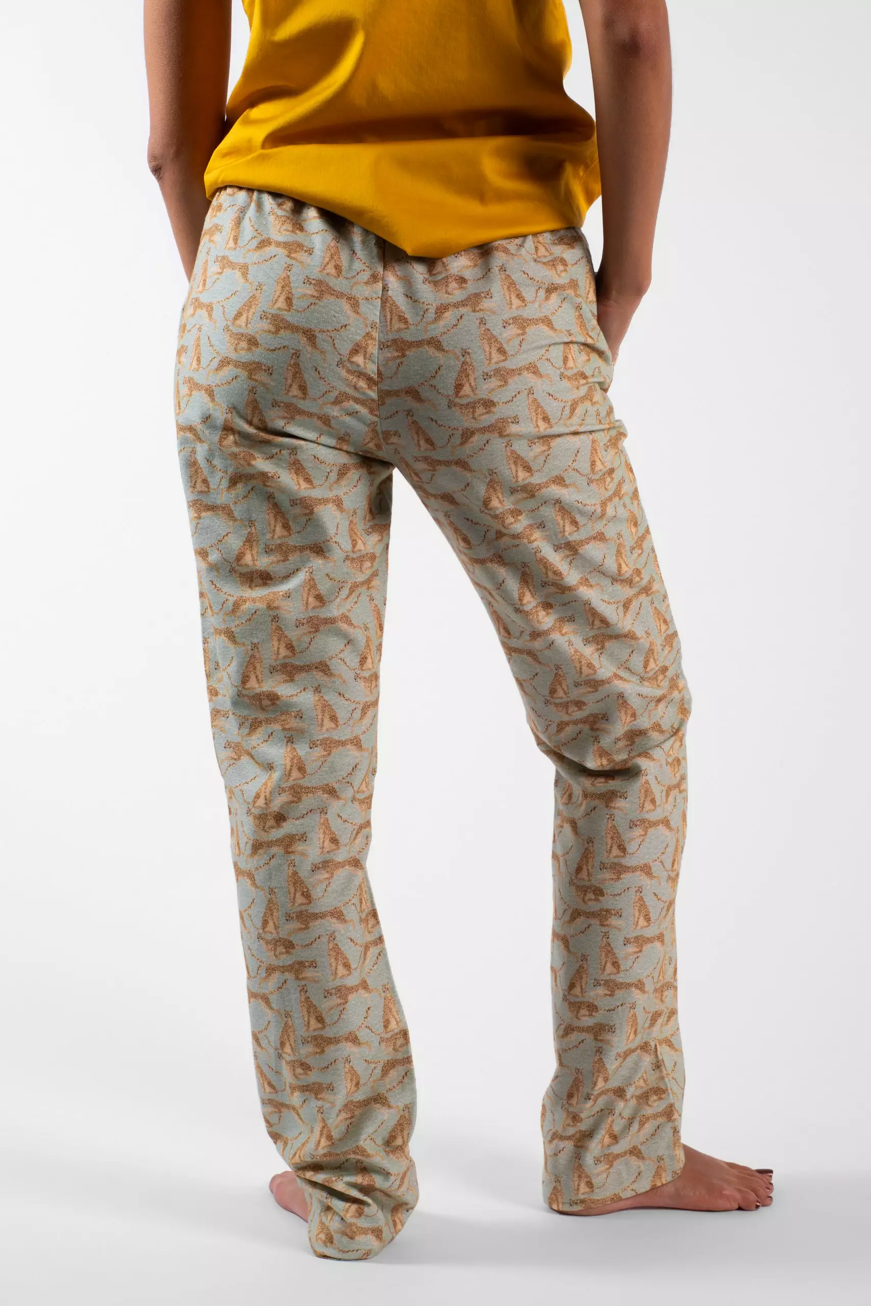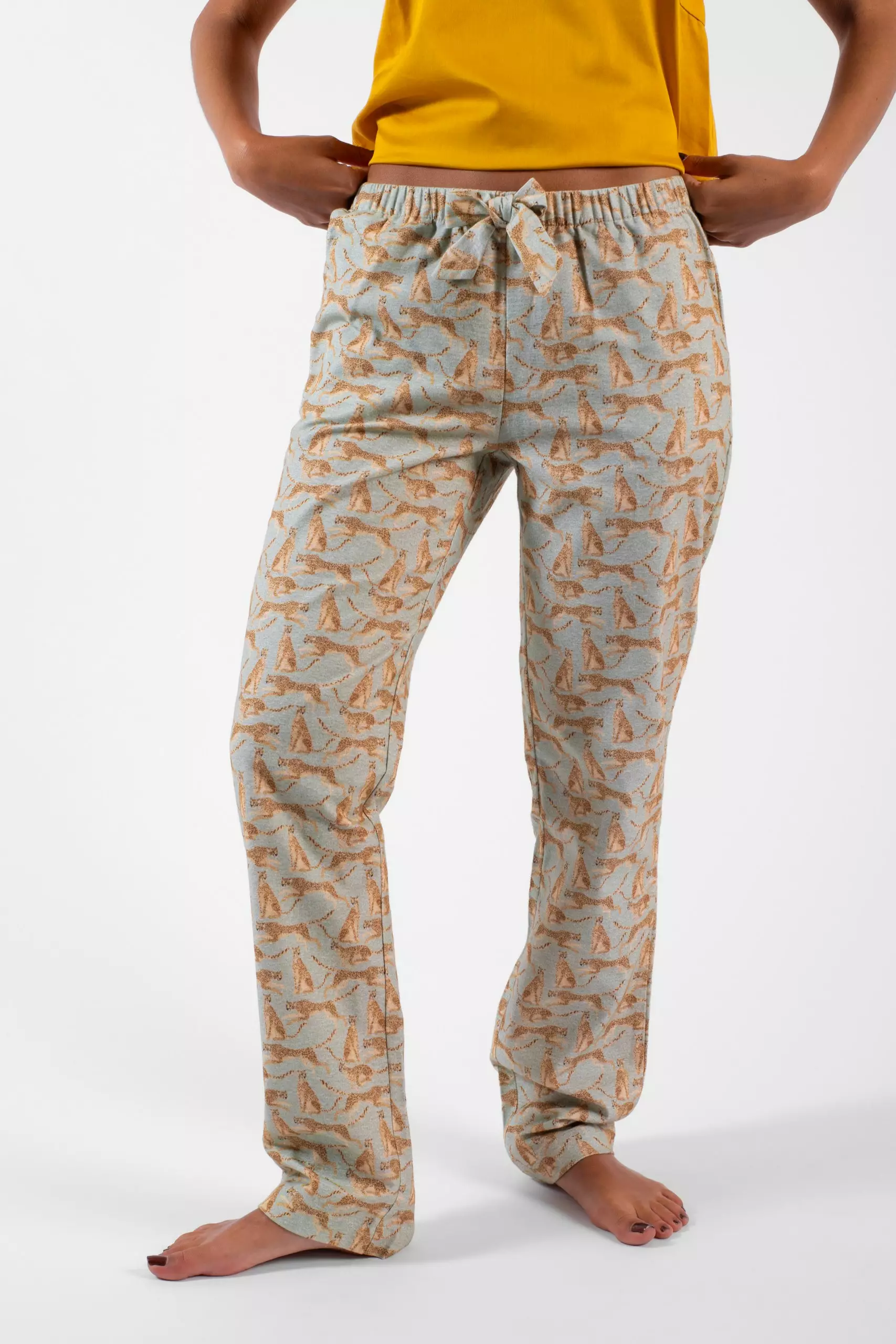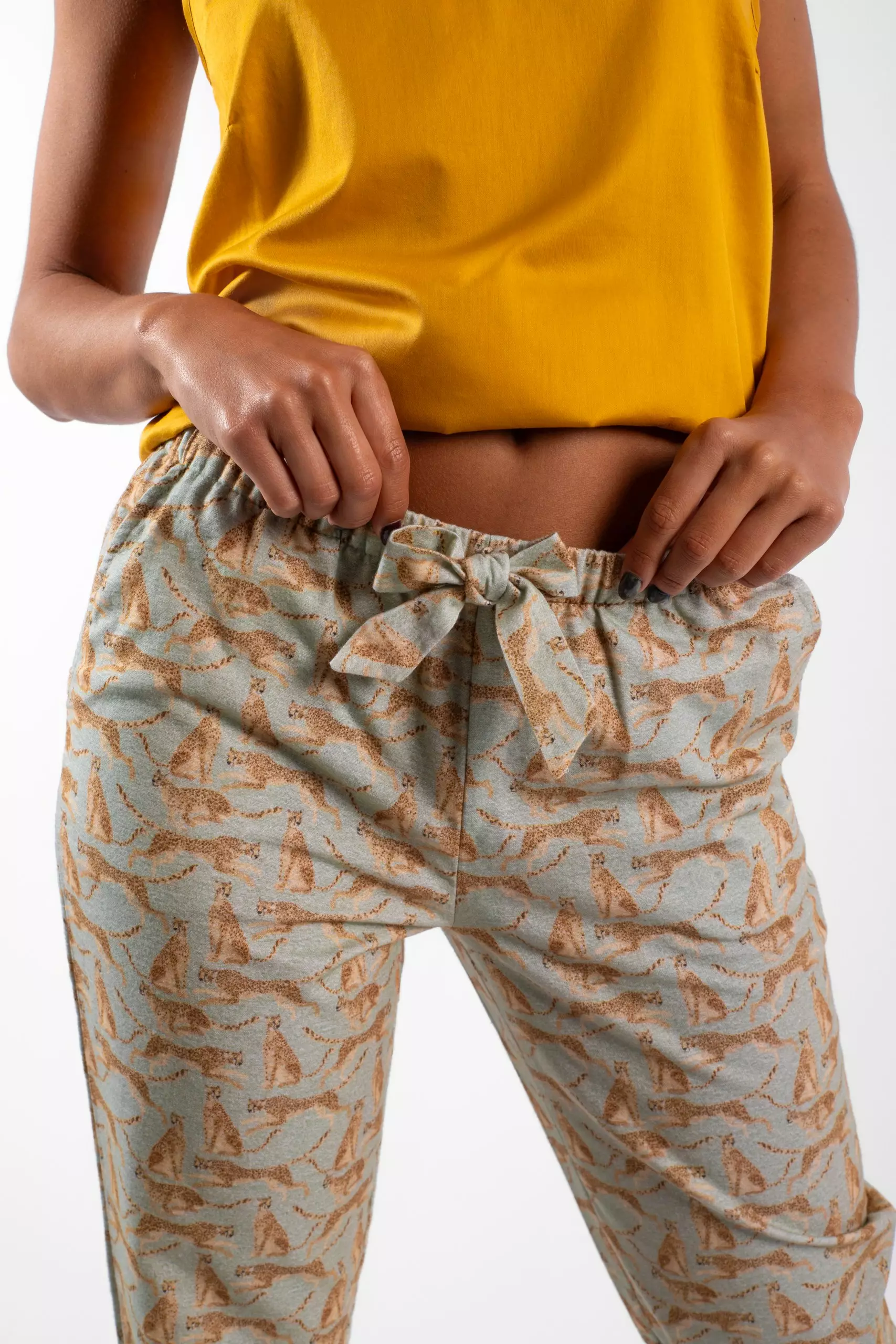 Détails : Pantalon, deux poches, ceinture élastiquée et noeud décoratif à l’avant.