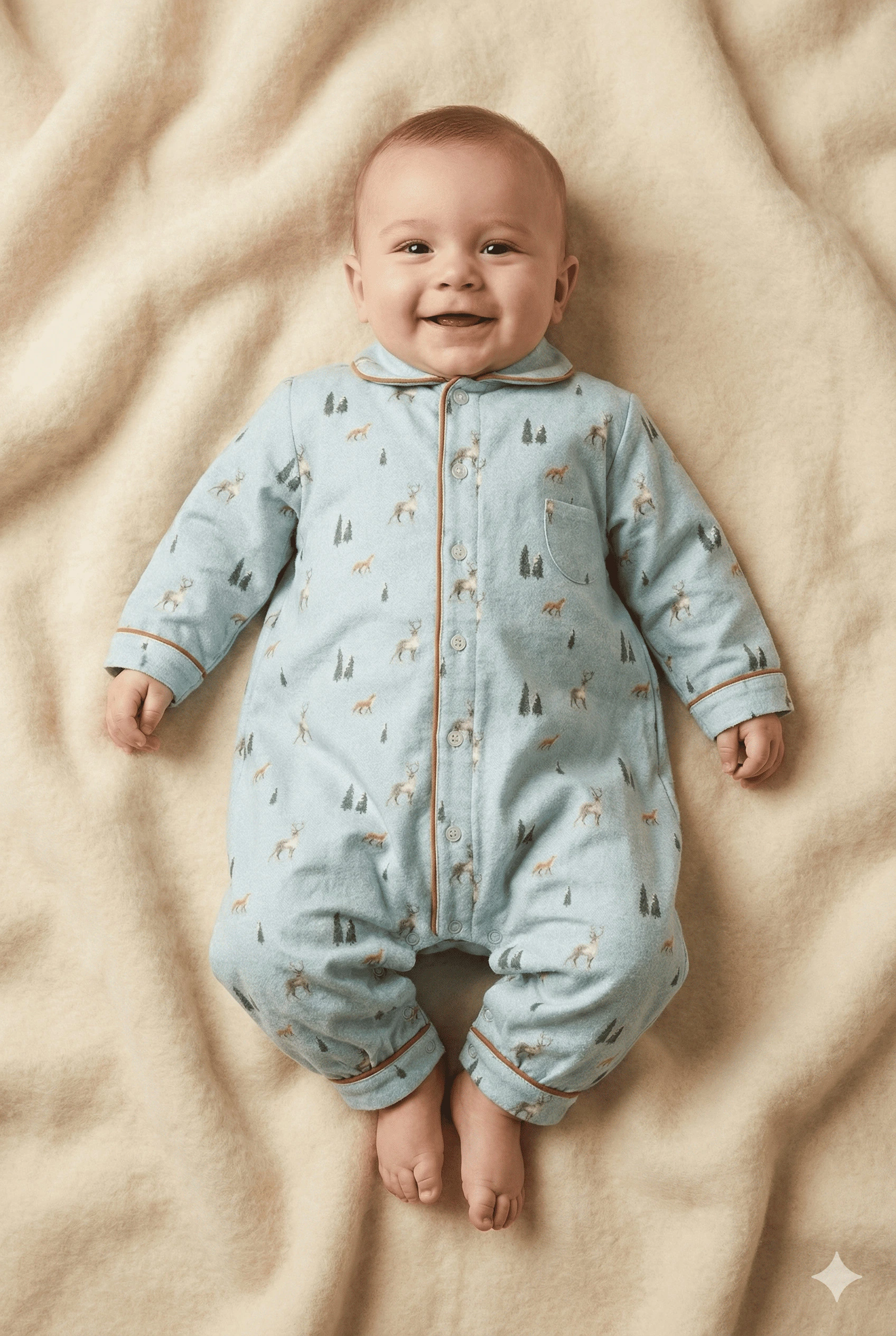 Ce pyjama bébé est une pièce complète à manches longues, dotée d’une ouverture boutonnée sur le devant. Il dispose également de pressions à l’entrejambe pour un habillage pratique.
