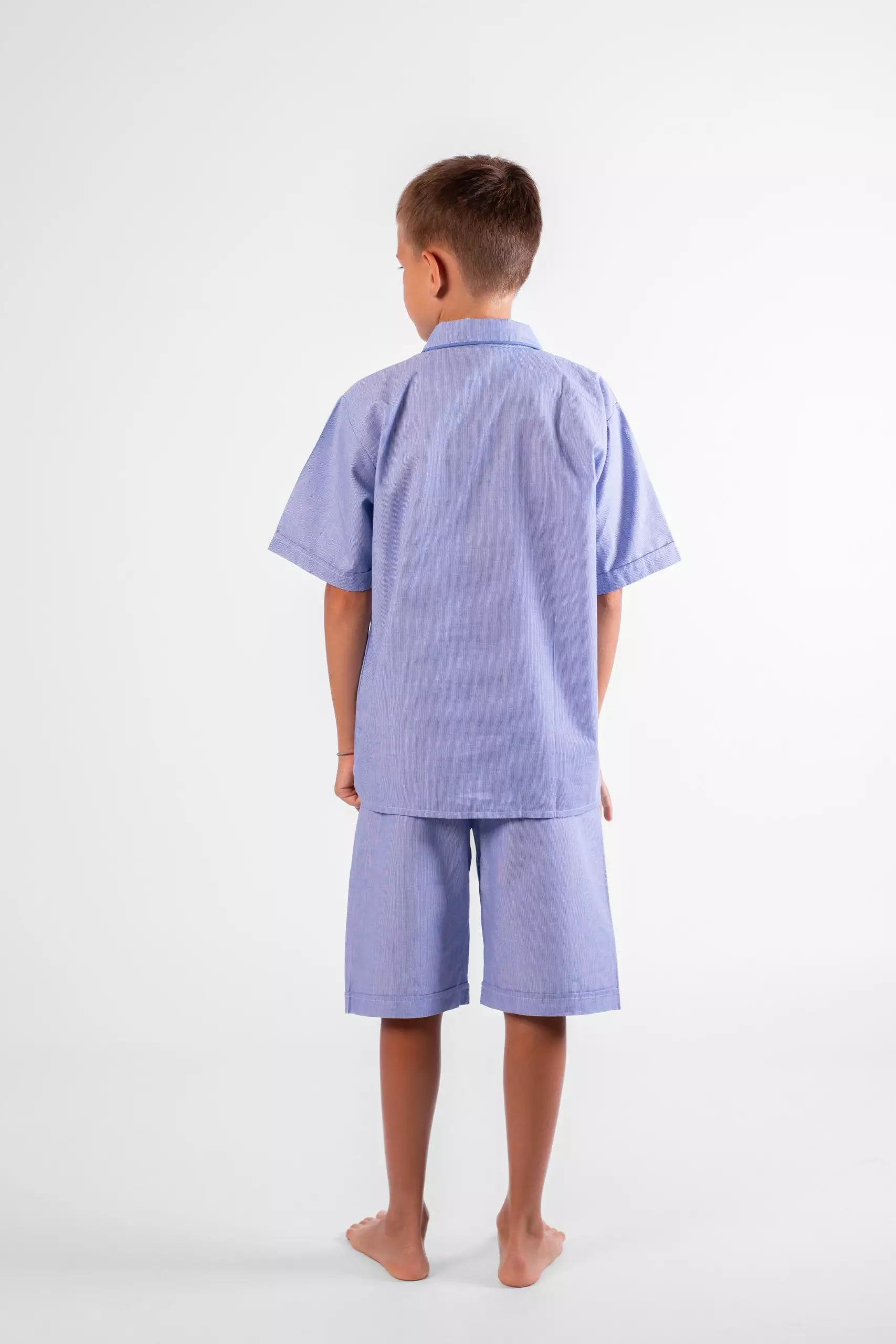 Pyjama court garçon en popeline de coton rayé bleu.