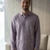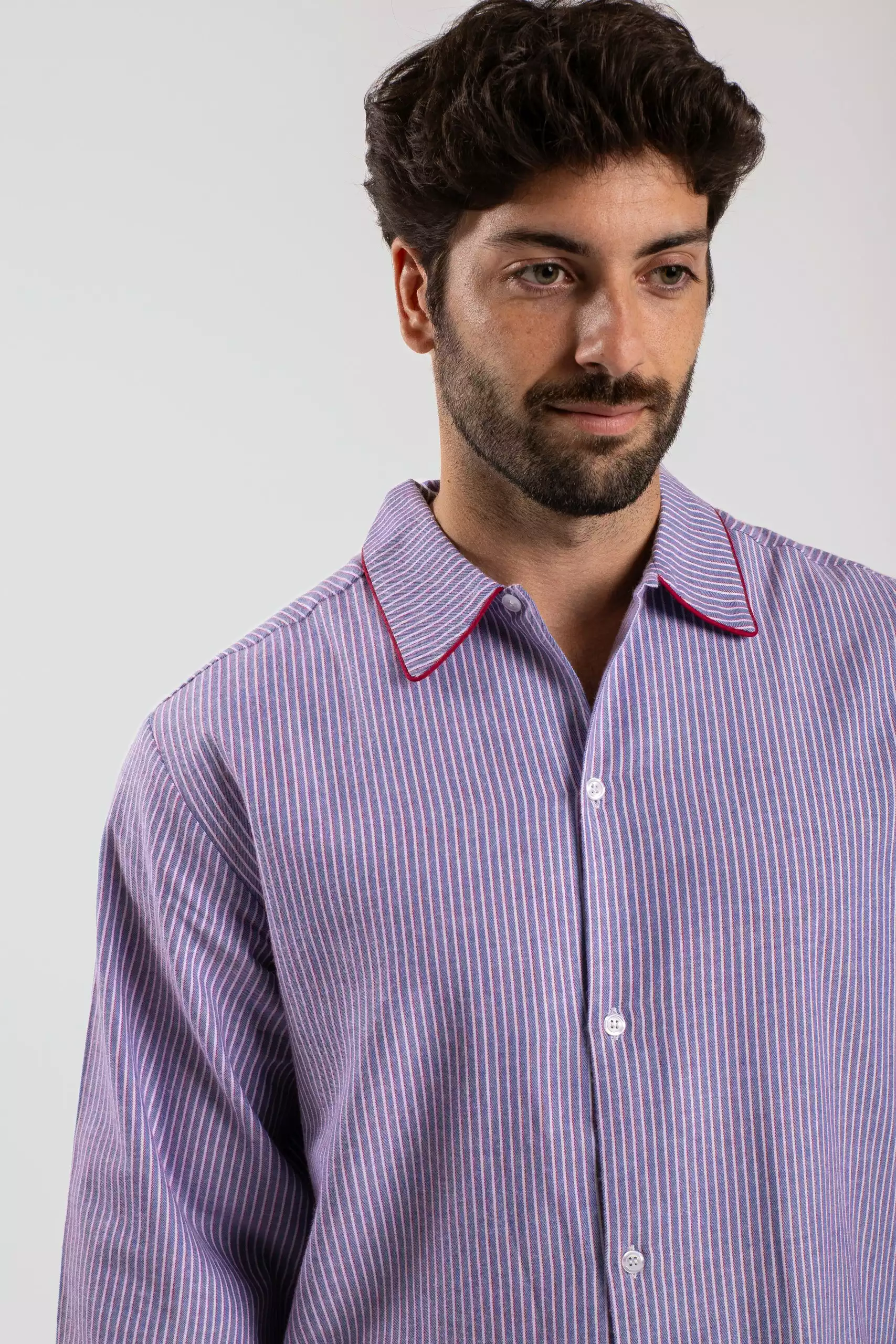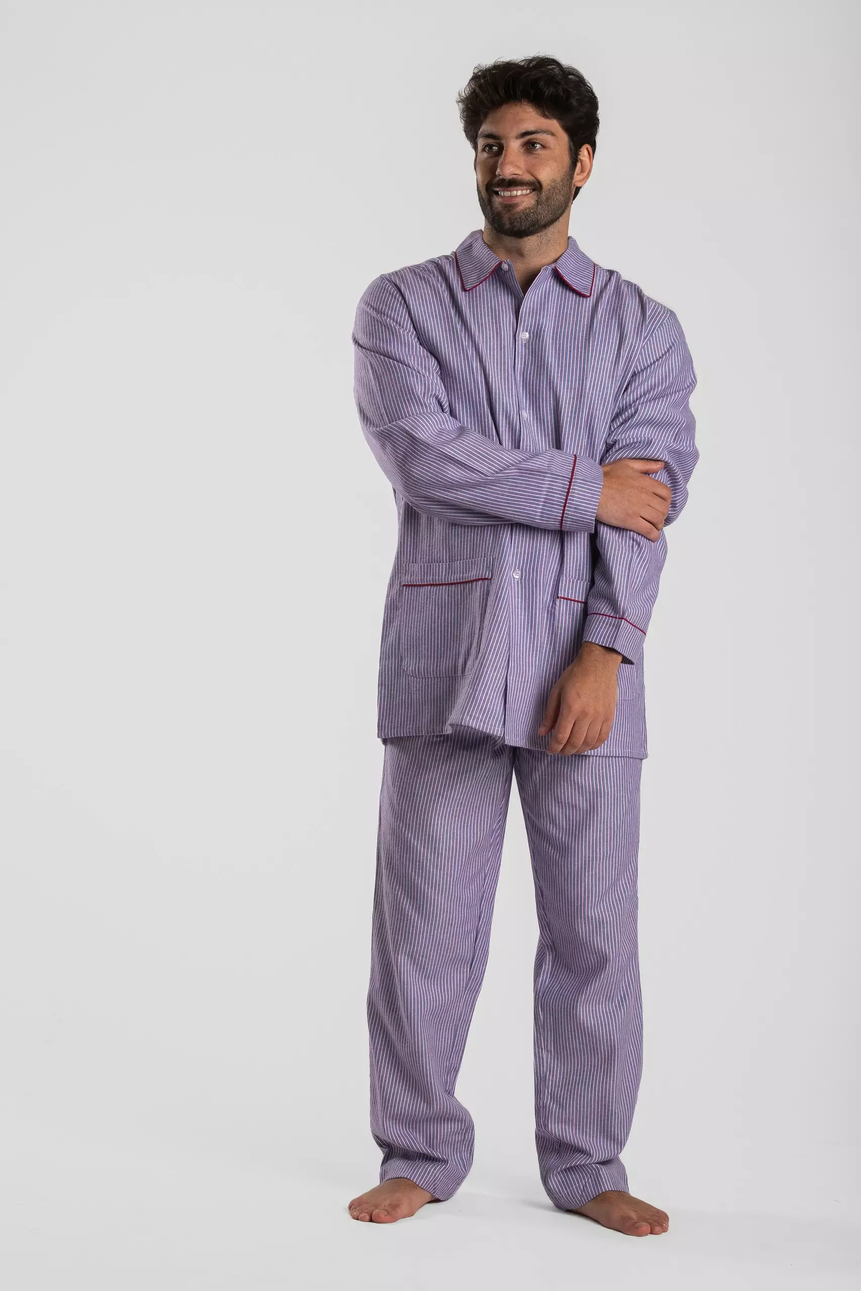 Détails : Chemise manches longues boutonée, pantalon, col et poches bordés d’un passepoil assorti.