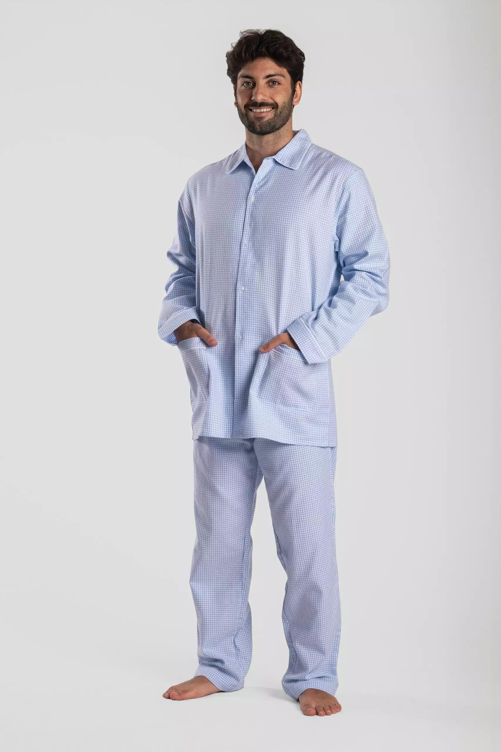Pyjama homme deux pièces en pilou/flanelle de coton carreaux bleu Vichy.
