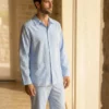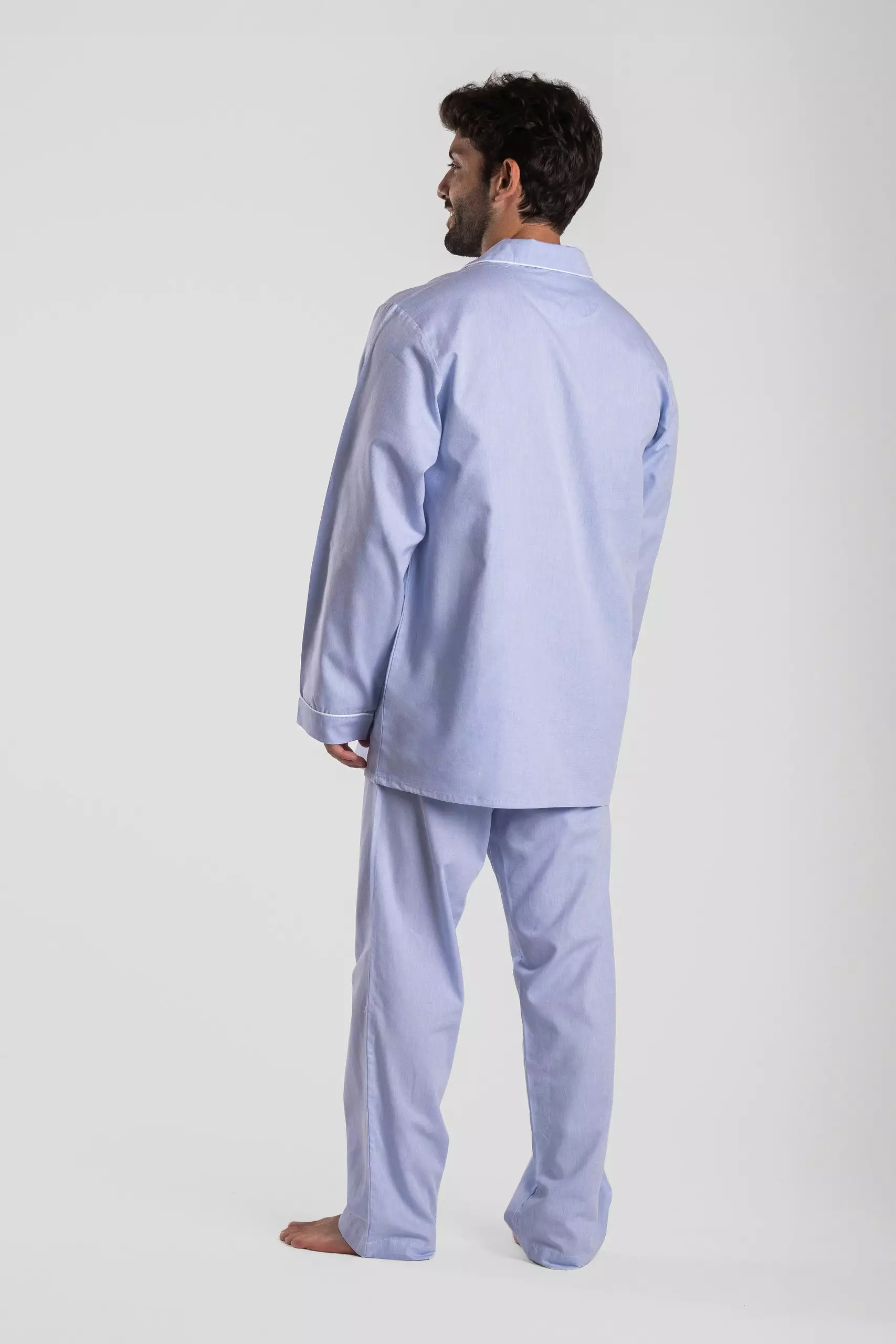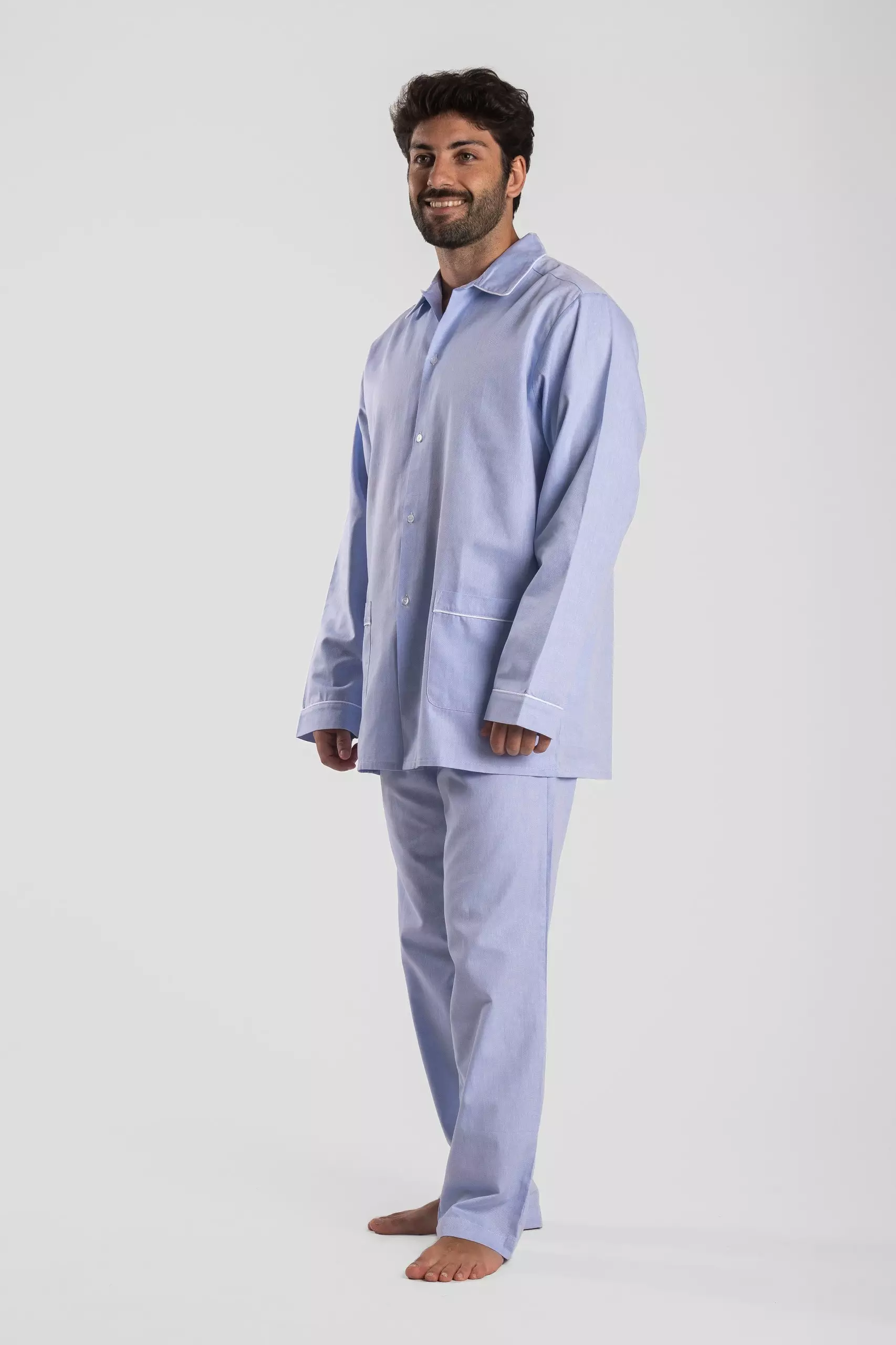Détails : Chemise manches longues boutonée, pantalon, col et poches bordés d’un passepoil assorti.