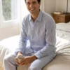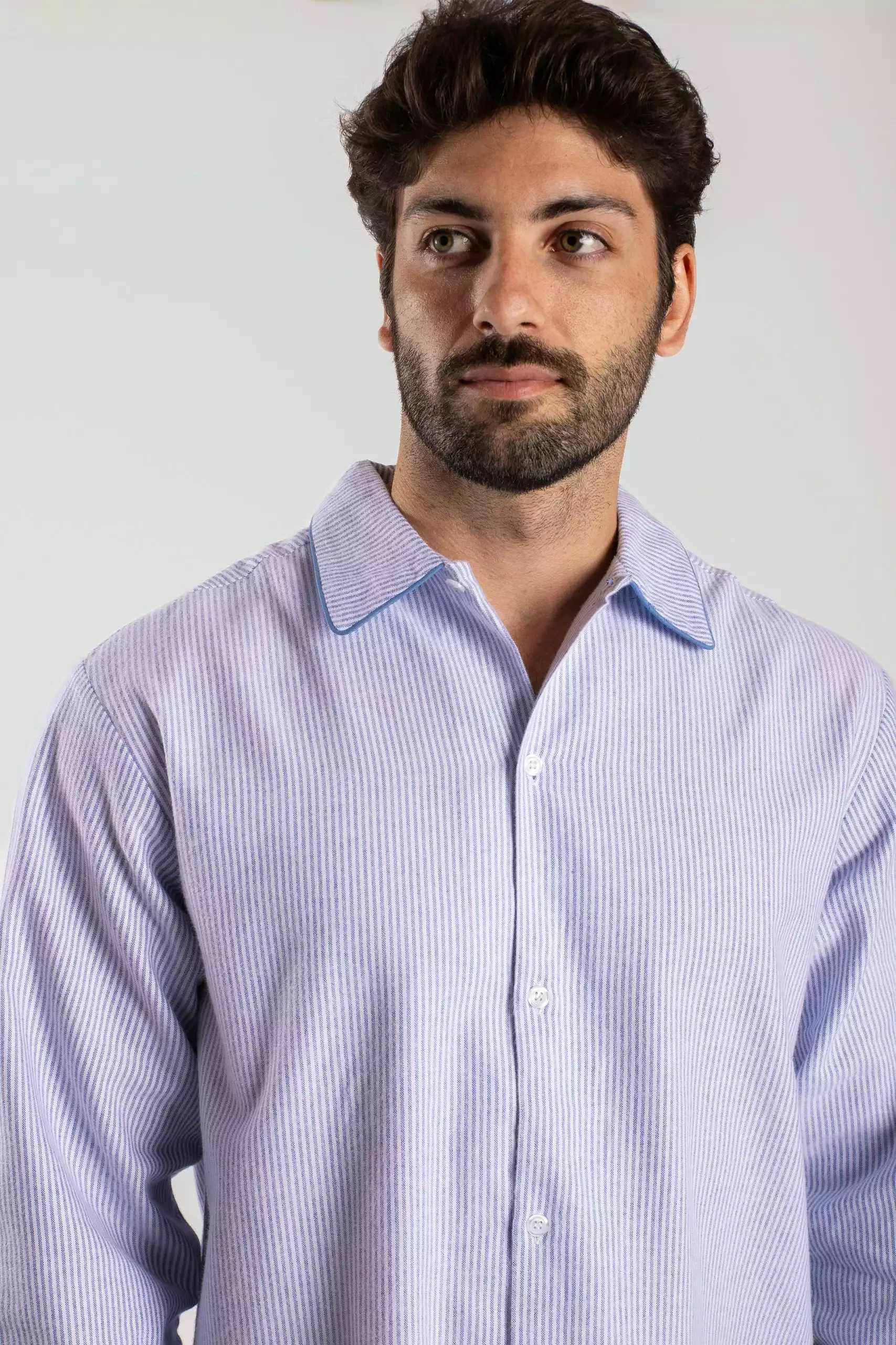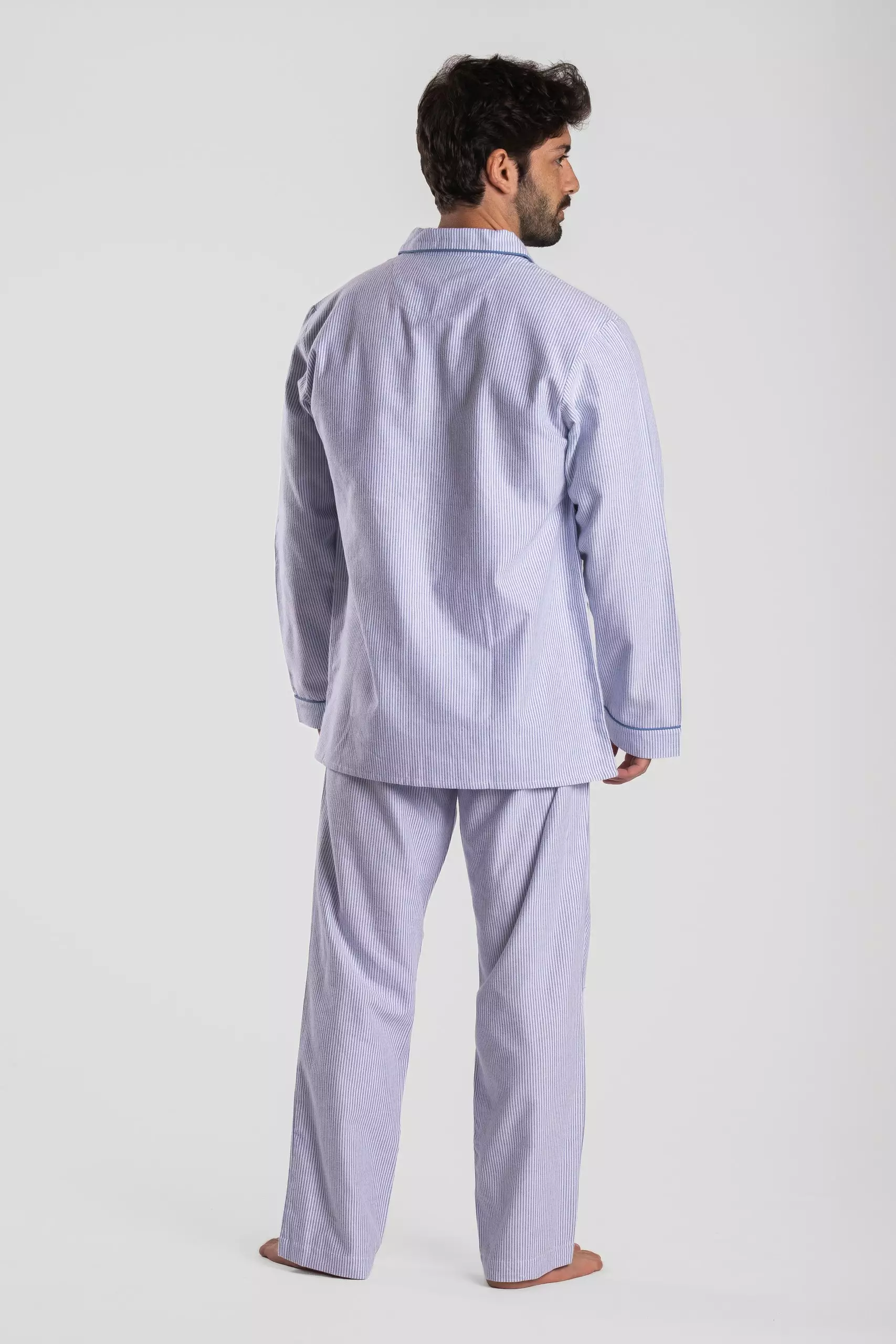 Détails : Chemise manches longues boutonée, pantalon, col et poches bordés d’un passepoil assorti.