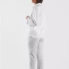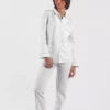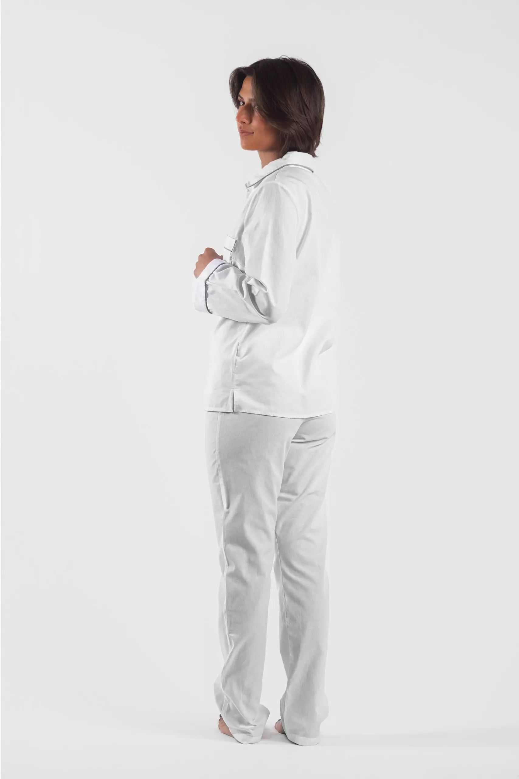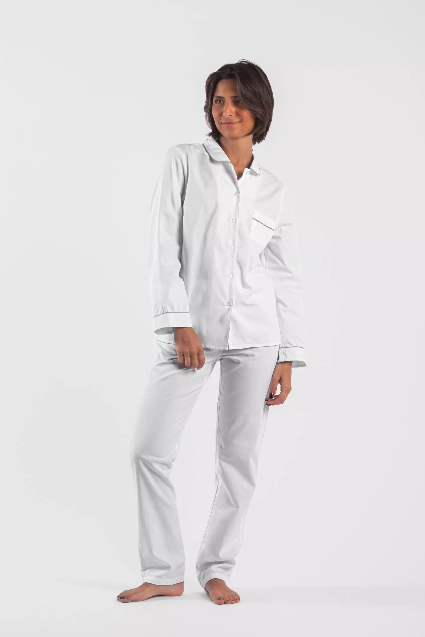 Détails : Chemise manches longues boutonée avec poche poitrine, pantalon, col et poches bordés d’un passepoil assorti.
