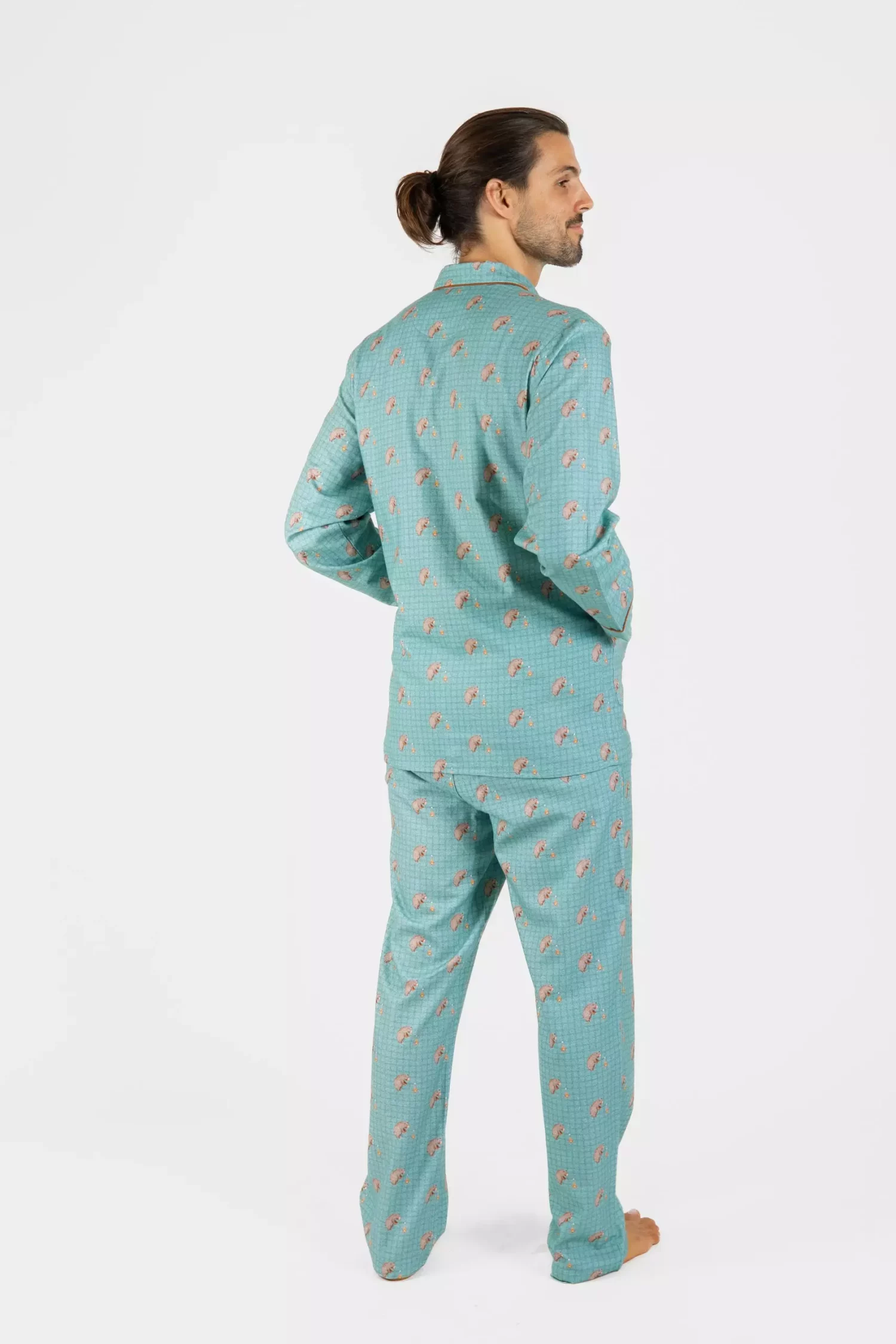 Détails : Chemise manches longues boutonée, pantalon, col et poches bordés d’un passepoil assorti.