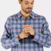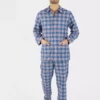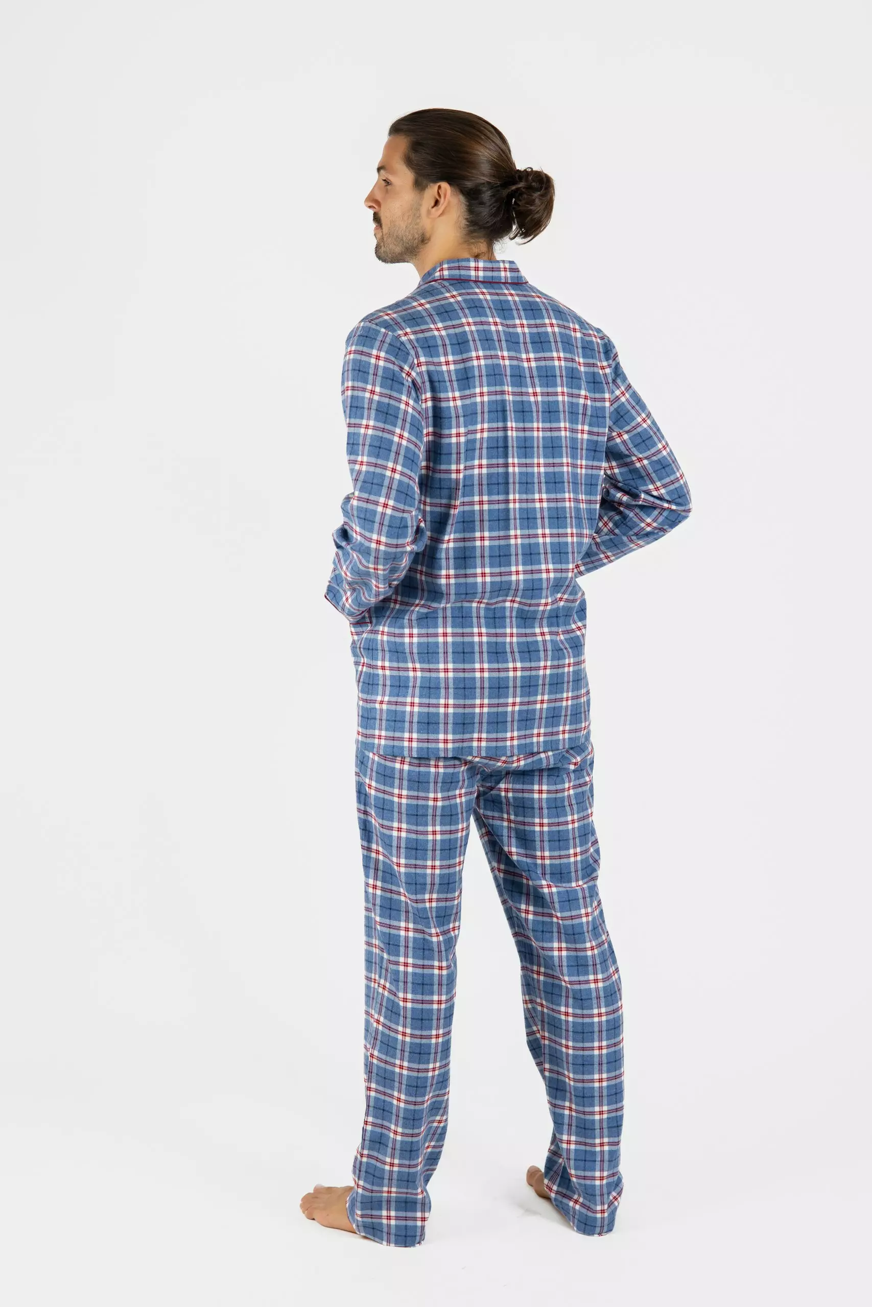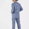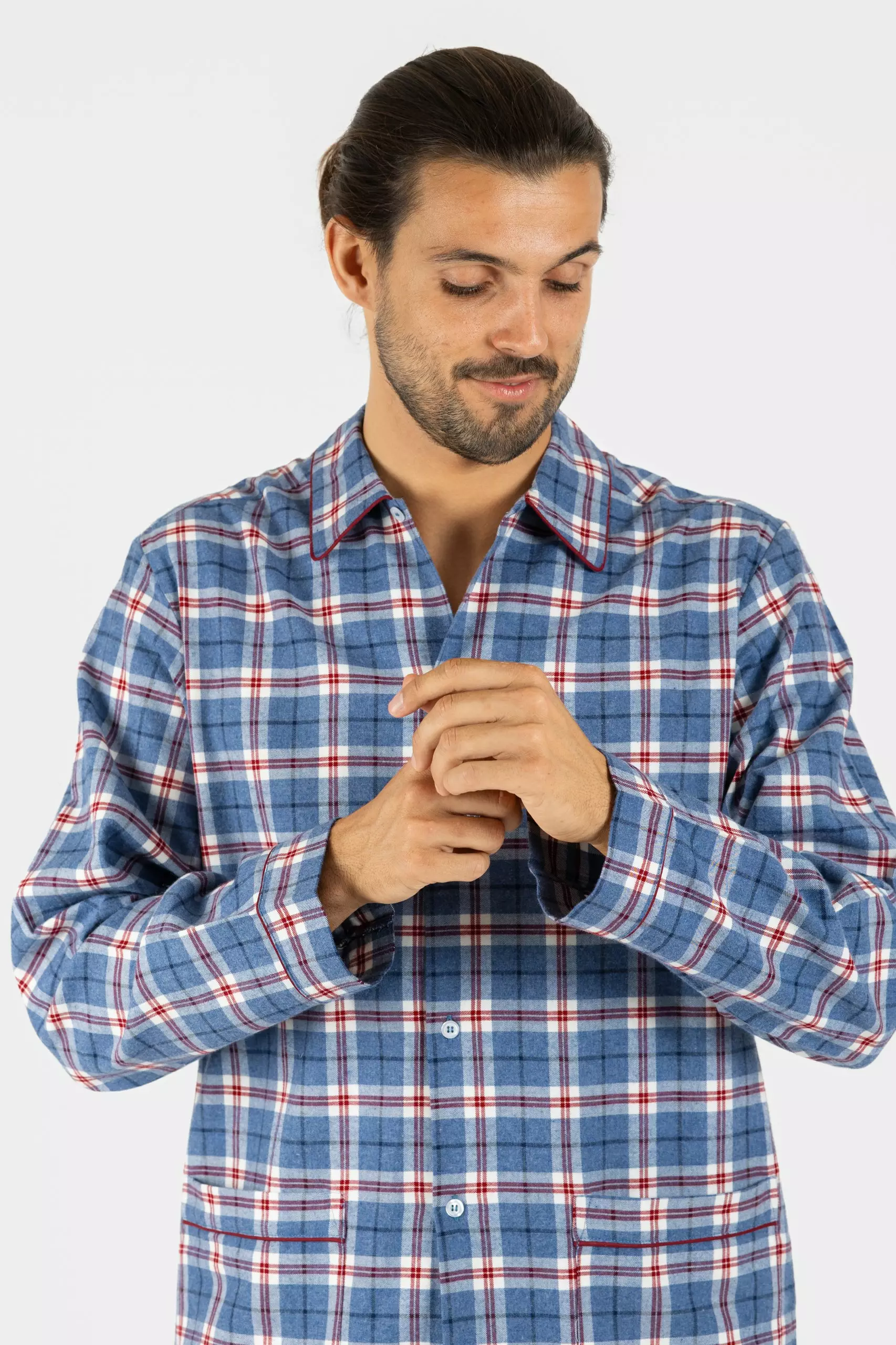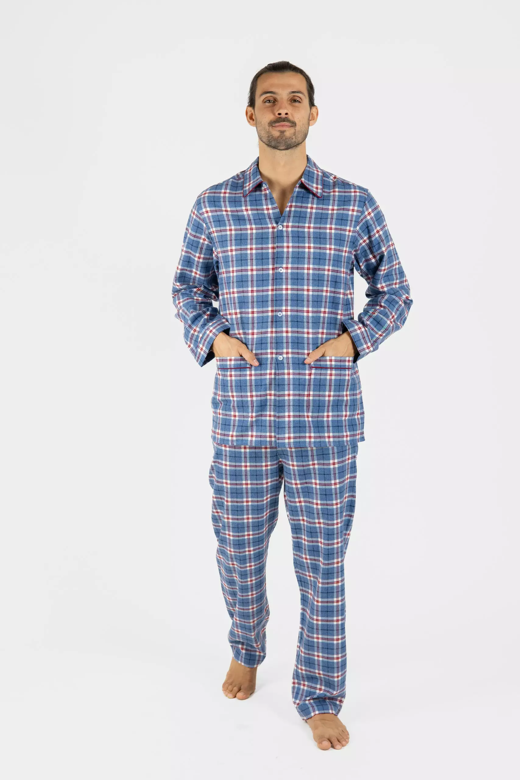 Détails : Chemise manches longues boutonée, pantalon, col et poches bordés d’un passepoil assorti.
